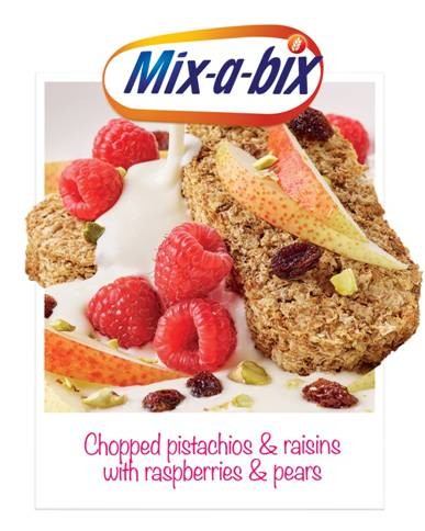 材料 : 2 塊 Weetabix 125毫升半脫脂牛奶或牛奶 半個梨 和少量紅莓 (新鮮或冷藏也可) 約20粒開心果 和 10克葡萄乾 (無籽)